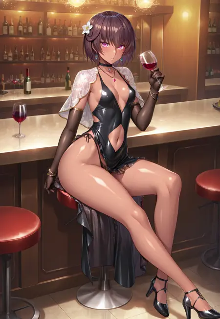 2번 의상: 노출형 의상, 검은 드레스, 검은 초커, 쇄골, 검은 장갑, 팔꿈치 장갑, 배꼽 노출, 검은 팬티, 하이레그 팬티, 하이힐, 보석, 목걸이, 떠다니는 귀걸이, 여러 개의 팔찌, 머리에 꽃, 다리 노출