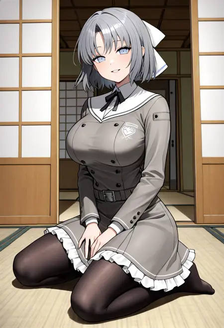 "YMISENRN、青い目、灰色の髪、髪のリボン、短い髪、大きな胸、学校制服、セーラー領、灰色のスカート、フリル付きスカート、黒いパンティストッキング"