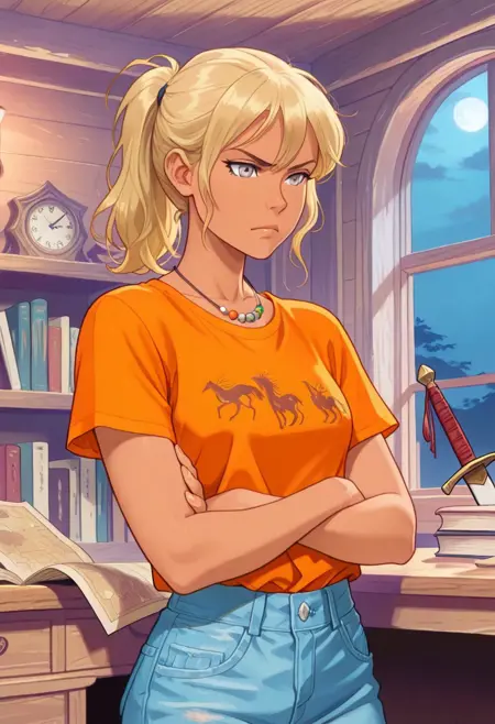 Use "orange shirt, short sleeves, denim jeans" for the Camp Half-Blood look. The text on her shirt can be weird sometimes, I dunno how to fix it.