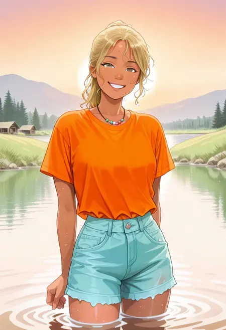 Use "Blonde hair, grey eyes, beaded necklace, tan" if you need to make her look more accurate. Sometimes she'll end up with blue eyes, you can use a face fixer and put more emphasis on "((grey eyes))" to fix it or put "blue eyes" in the negative prompt.