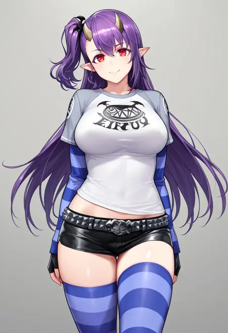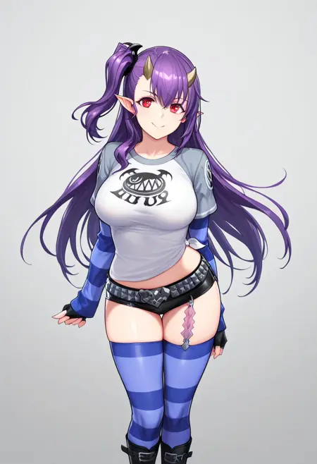 Appearance: long hair, purple hair, side ponytail, hair ornament, red eyes, oni horns, large breasts, pointy ears, monster girl, demon girl