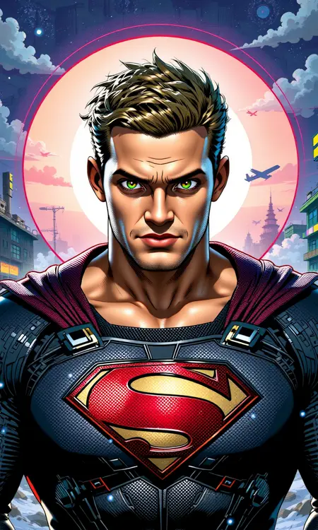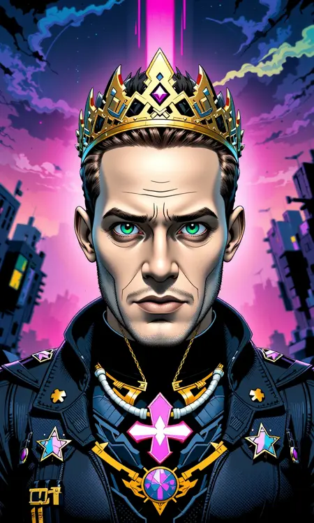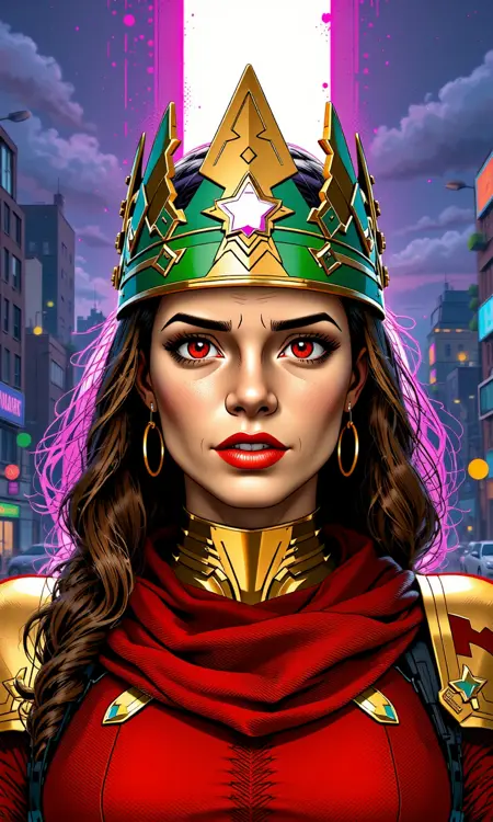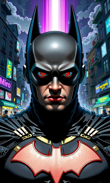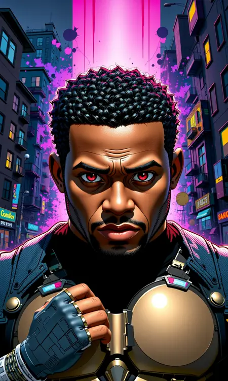 #subject, 만화 액션 솔로 장면, intoTheVerse 스타일, 만화 일러스트, 클로즈업, 정면 시점, 시청자 바라보기, 할톤 텍스처와 미세한 잉크 선, 할톤 만화 점 효과, 연분홍 뒤광 효과, 반톤 만화 점 효과가 있는 배경, 고세부 만화 만화 일러스트, 어두운 도시 야경 배경