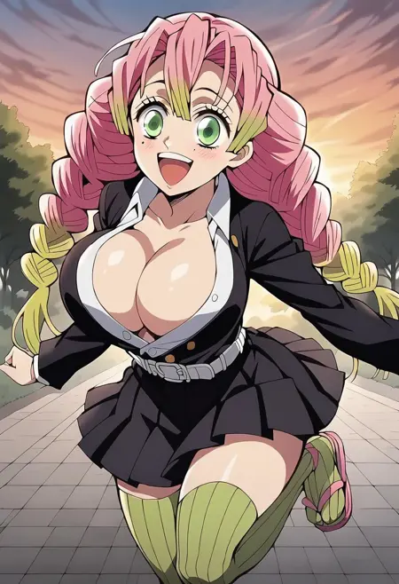 Base: Mitsuri Kanroji, pink hair, gradient hair, two-tone hair, long hair, twin braids, green eyes, large breasts, one mole under eyes,