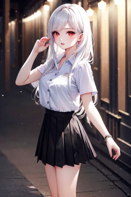 -Word: White shirt short sleeves, Black pleated skirt,Black pencil skirt, Belt