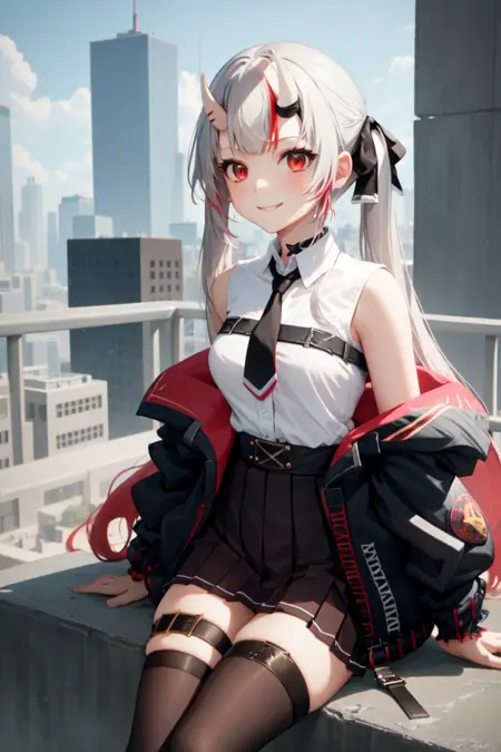"仲切りあやめ、長髪、ツインテール、AyameCasual、白いシャツ、ノースリーブシャツ、黒いネクタイ、黒のスカート、プリーツスカート、髪のリボン、X型ヘアアレンジ、黒のハイヒール、太ももストラップ、黒のジャケット、オープンジャケット、ノースリーブ、黒のチョーカー"
