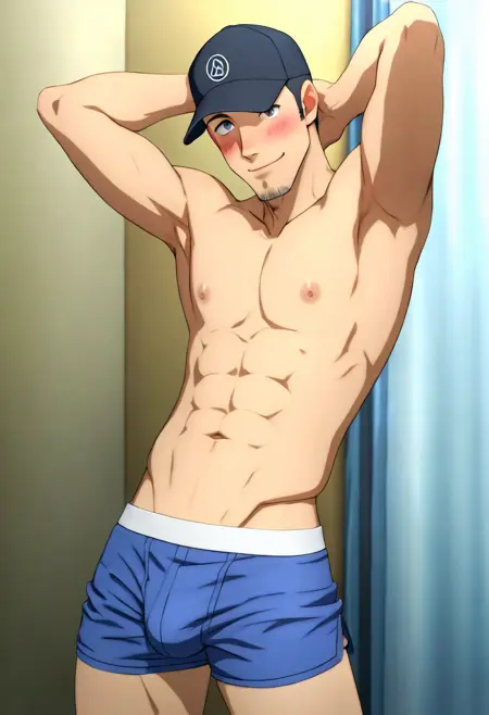 Other tags in the training: male focus, 1boy, solo, smile, simple background, navel, muscular, grin, blush, jewelry, necklace, white background, one eye closed, thighs, muscular male, bara, looking at viewer