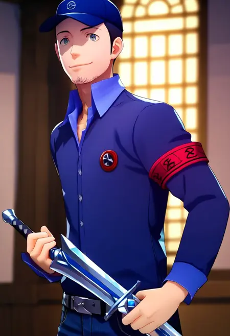 Activation tags: junpei, facial hair, black hair, baseball cap, hat, short hair, goatee