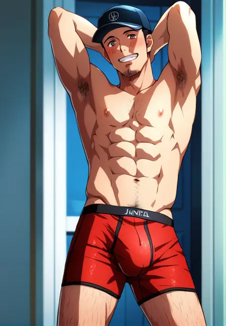 학습에 사용된 다른 태그: 남성 중심, 1남자, 혼자, 미소, 단순한 배경, 배꼽, 근육질, 웃음, 얼굴 붉힘, 보석, 목걸이, 흰색 배경, 한쪽 눈 감음, 허벅지, 근육질 남성, 바라, 시청자 바라보기