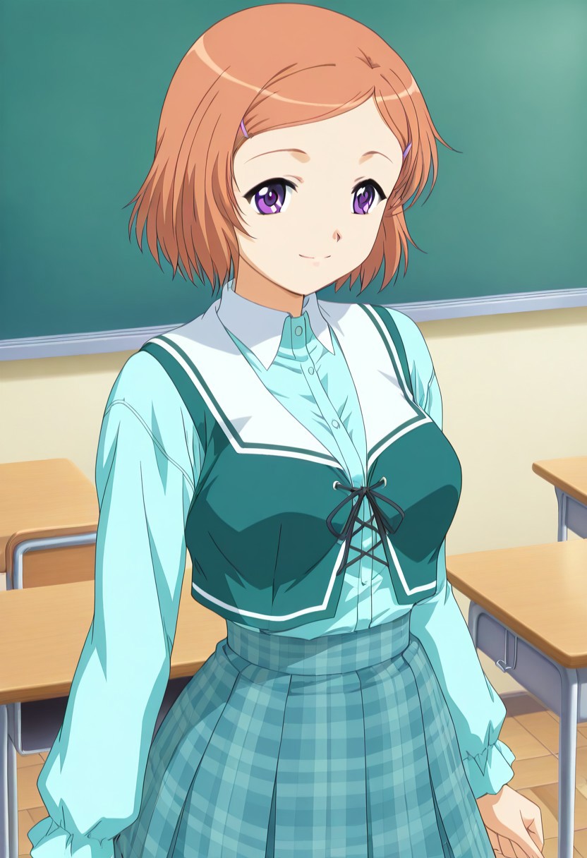 トリガー:KazuMiri、1girl、solo、オレンジ色の髪、ボブカット、分け目のある前髪、ヘアクリップ、紫の目、制服、グリーンのボディースーツ、チェック柄のスカート