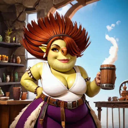 赤髪、黄瞳、薄緑色の肌/体、深紅色の髪、スカート、体の模様、顔の模様、パープルのアイシャドウ、ブレスレット。