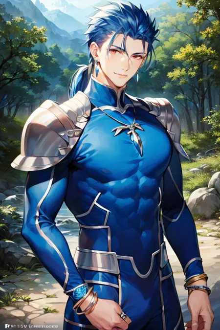 cu chulainn - lancer (fate), blue hair, long hair, spiked hair, low ponytail, red eyes, blue bodysuit, bracelet, earrings, jewelry, necklace, shoulder armor