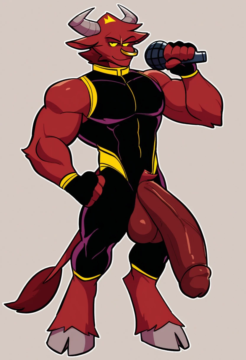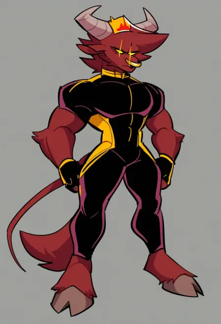 | Trained Words | KingFWKFNF, 1boy, anthropomorphic bull, light gray horns, dark red fur, glowing yellow eyes, velvet hooves, tail, golden ring over nose, nose ring, black latex suit with yellow outlines, black latex fingerless gloves, yellow spot at the top of head that resembles a crown, cartoonish, cartoon style, cartoon, 2d, digital art, 2d art, Copied! |