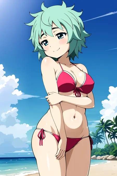 앞치마, 반다나, 뺨빨개, 녹색 머리, 파란 눈