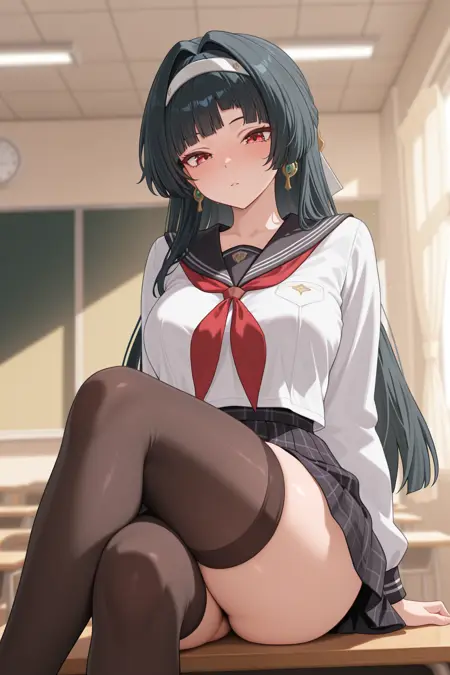 Appearance: long hair, white hairband, hair intakes, blunt bangs, black hair, red eyes, earrings, large breasts.