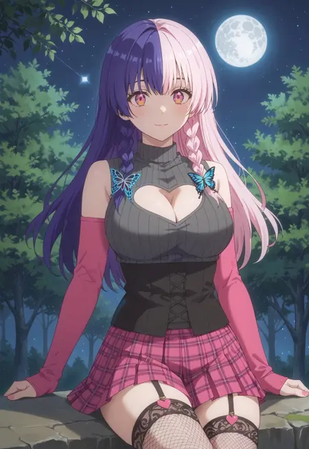 _nagomi_kk, nagomi, 長髪, 前髪, 紫髪, ピンク髪, 多色髪, 二色髪, カラー分け髪, ピンク目, 紫目, オレンジ目, 多色目, 三色目, 大きな胸, 成熟した女性, スカート, バストライン, プリーツスカート, ダブルスリーブ, セーター, チェック柄, 衣服カットアウト, チェックスカート, バストカットアウト, ピンクスカート, ハートカットアウト, ツインテール, バストライン, バストカットアウト, 青い蝶の髪飾り, ピンクプリーツスカート, フィッシュネット太ももハイ, シンクレス, ピンクひじ手袋,