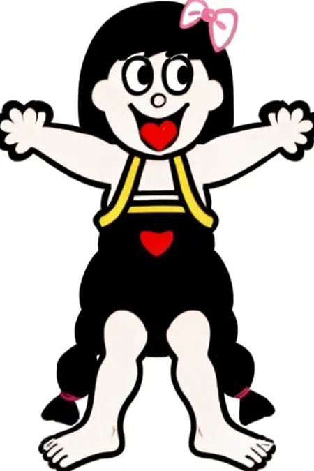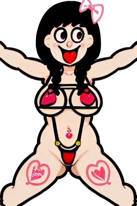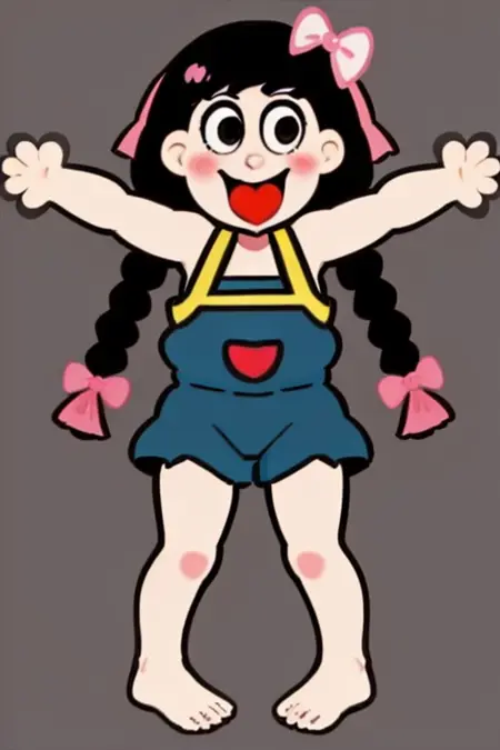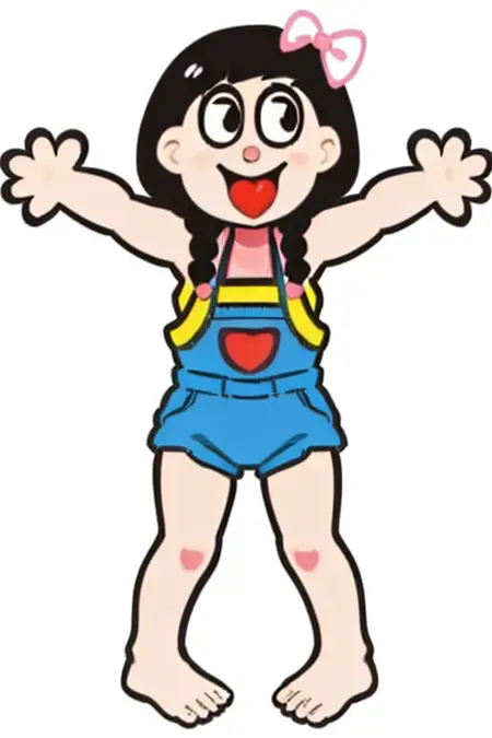 wantwant, heart in mouth, heart tongue, 1girl, open mouth, barefoot, smile, black hair, outstretched arms, flat color, :d, suspenders,