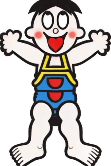 wantwant, heart in mouth, heart tongue, 1boy, open mouth, barefoot, smile, black hair, outstretched arms, flat color, :d, suspenders, shirt,