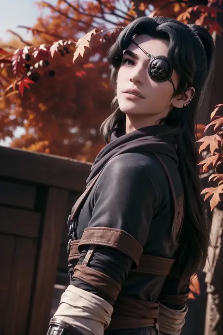 黒い服、黒いジャケット、顔にスカルが描かれたアイパッチ、赤いスカーフ,