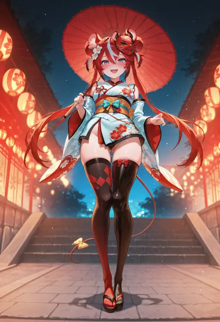 baenewyear, 长发, 发髻, 双发髻, 头发花饰, 和服, 分离袖, 腰带, 绑带, 头戴面具, 过膝袜, 不匹配的下装,