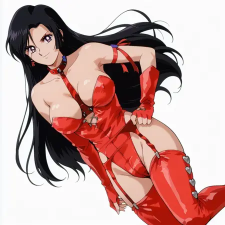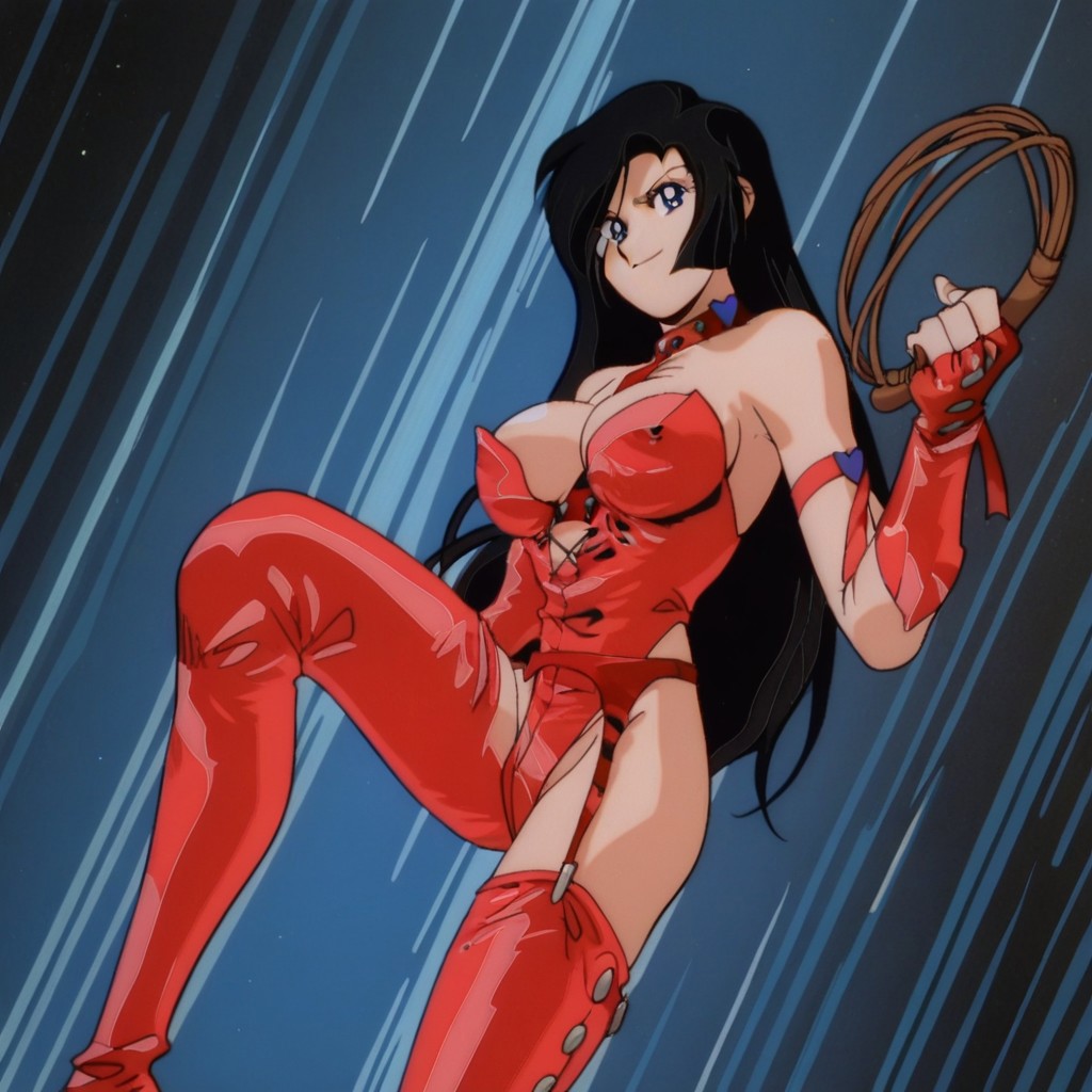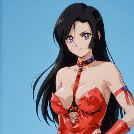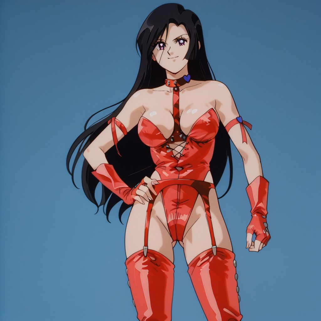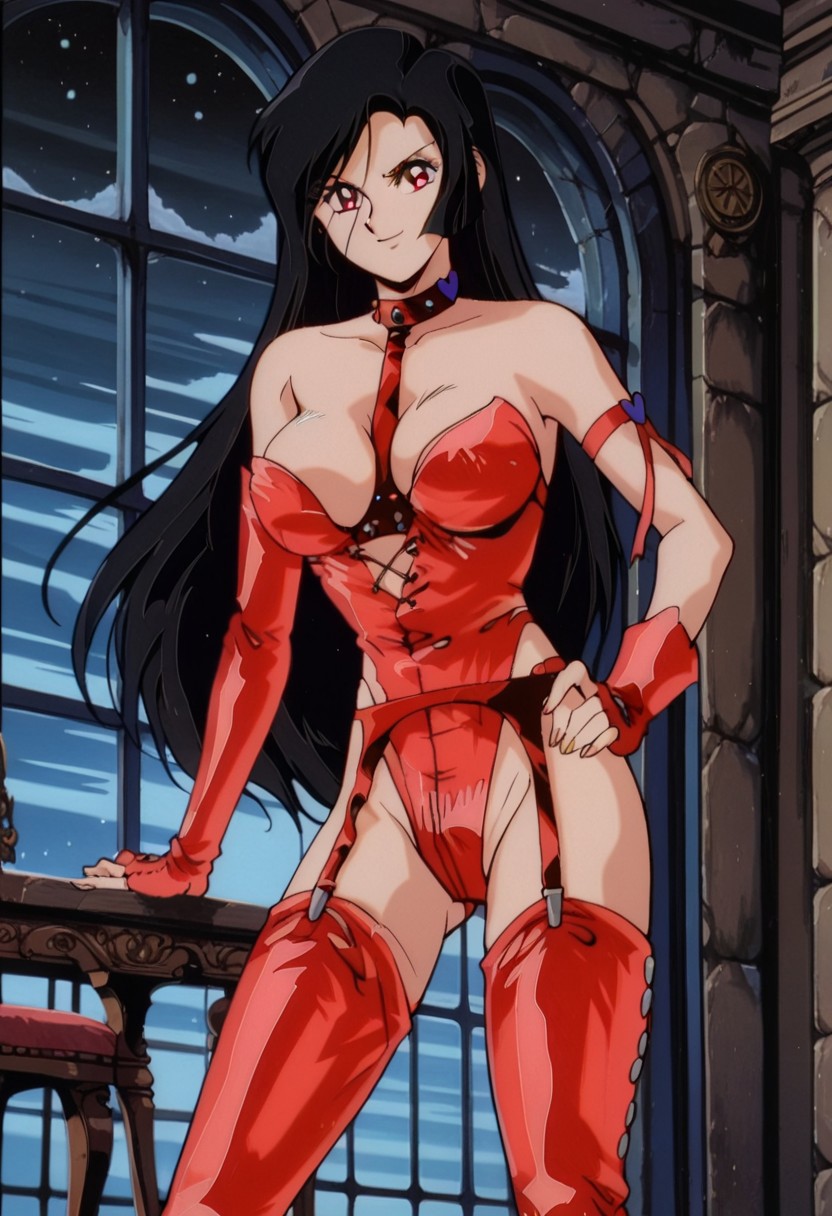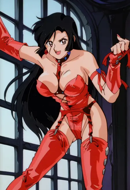 score_9,score_8_up,score_7_up, BREAK アニメスクリーンキャプチャ, アニメスクリーンショット, source_anime, ppp, (masterpiece:1.5), (best quality:1.5), (amazing quality:1.5), (very aesthetic:1.3), (absurdres:1.4), newest, scenery, perfect face,(intricate:1.2),beautiful scenery, extremely detailed, perfect anatomy, (beautiful detailed eyes:1.0), detailed beautiful face, (detailed beautiful face and eyes:1.2),retro artstyle, 1990s (style), uncensored, (clear eyes:1.0), HoneyKi_SMqueen, high definition, detailed eyes, detailed face,(detailed body), (detailed hands),1girl, female, purple eyes, black hair, long hair, heart-shaped choker, dominatrix, red suit, cleavage, rose earrings, red leather, garter belt, garters, garter straps, tight high heel boots, fingerless elbow gloves, fingerless gloves, large breasts, smile, solo, black hair, breasts, long hair, bondage outfit, gloves, high heels, thigh boots, thighhighs, boots, red gloves, red footwear, perfect body,
