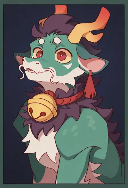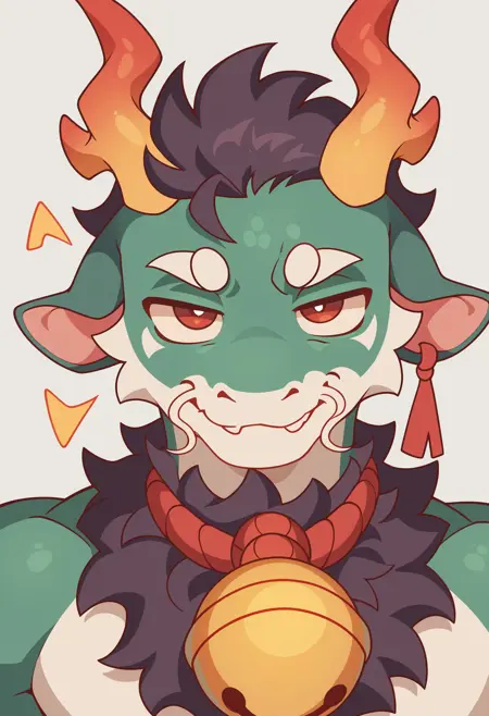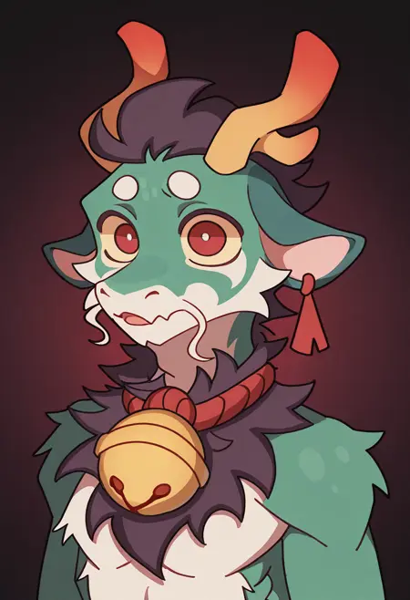Illustrious: best quality, amazing quality, very aesthetic, absurdres, newest, greene, solo, antlers, male, red eyes, horns, 1boy, bell, colored sclera, ...your tags...