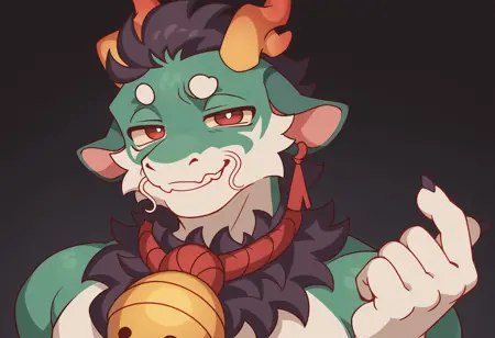 Pony: score_9, score_8_up, score_7_up, high quality, hires, male, solo, anthro, furry, antlers, red eyes, bell, looking at viewer, claws, looking at viewer, ...your tags...