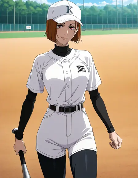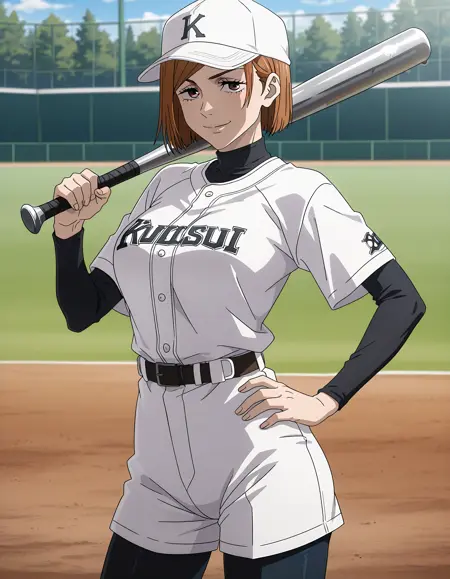スポーツウェア、野球ユニフォーム、野球キャップ、ホワイトヘアウェア、ホワイトシャツ、ブラックアンダーシャツ、タートルネック、ハイウエストショーツ、ホワイトショーツ、ブラックベルト、ベルトバックル、ブラックレギンス