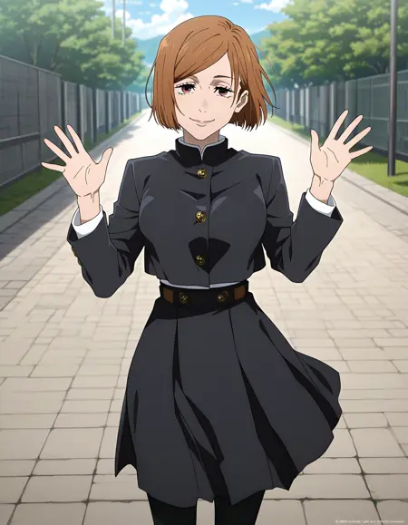 1girl, solo, kugisaki nobara, jujutsu kaisen, anime coloring, anime screenshot, general, short hair, bob cut, orange hair, red eyes, gakuran, black jacket, cropped jacket, long sleeves, white shirt, collared shirt, brown belt, black skirt, high-waist skirt, black pantyhose, brown loafers