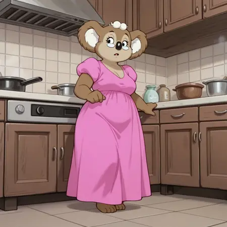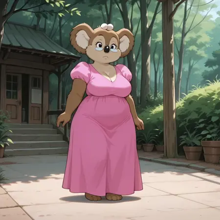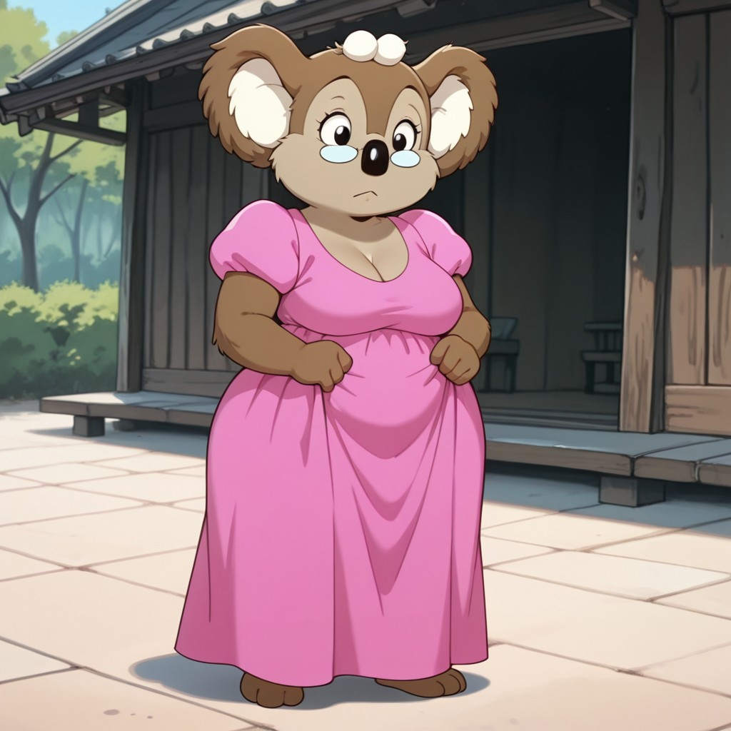 mrskoalabbil, semi-anthro, female, koala, brown fur, black eyes, round glasses, pink dress, puffy short sleeves, long dress