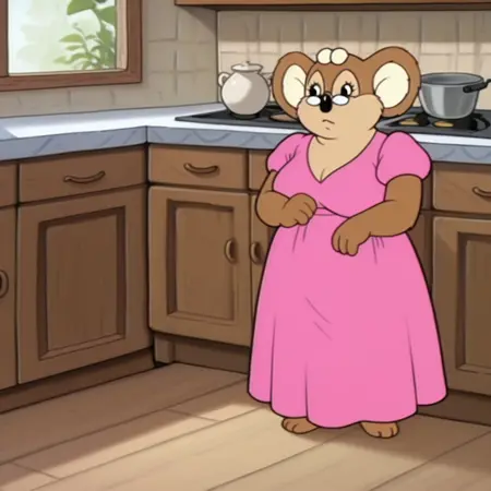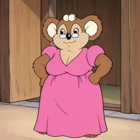 mrskoalabbilv2, semi-anthro, female, bbkolagirl, brown fur, black eyes, round glasses, pink dress, puffy short sleeves, long dress