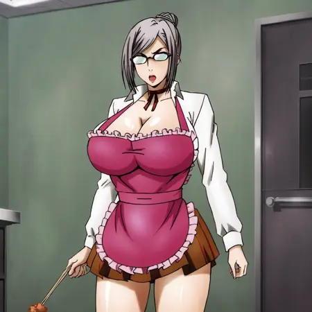 アプロン付きトリガー:MeikoApron, 1girl, 巨乳, 胸元, 不透明な眼鏡, アプロン, 灰色の髪, 片側结び, チョーカー, スカート, カウボーイショット
