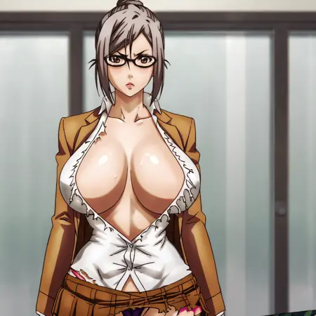 トリガー:Meiko, 1girl, 巨乳, めがね, スカート, 学校制服, 灰色の髪, サイハイ, 胸元, 片側结び, 開いた服, チョーカー, ジャケット, ブラなし, 開いたシャツ, 短い髪, カウボーイショット
