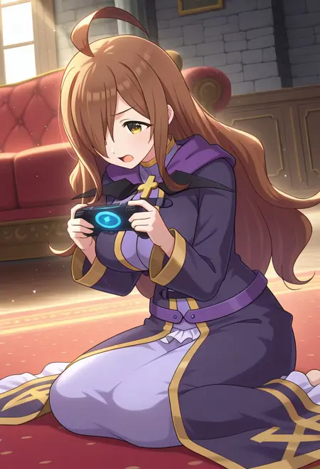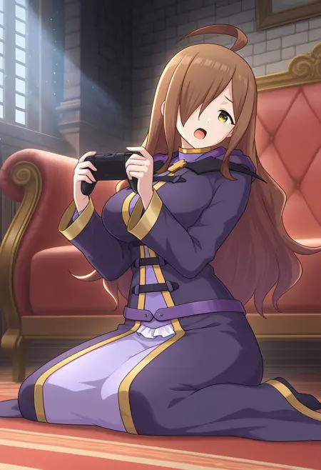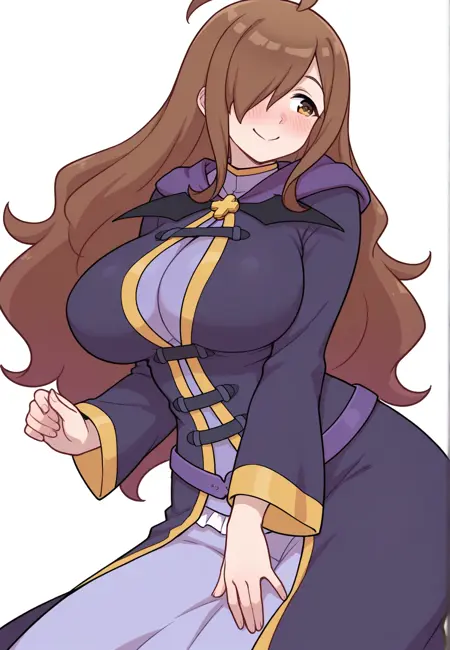 프롬프트: Wiz-Liver020, 1girl, solo, ahoge, long hair, purple robe, large breasts, hair over one eye, long sleeves, long_sleeves, dress, boots, robe, purple_robe, brown eyes, brown hair, very long hair, purple dress, cross, hood down, purple belt, big breasts, large breasts, cute smile