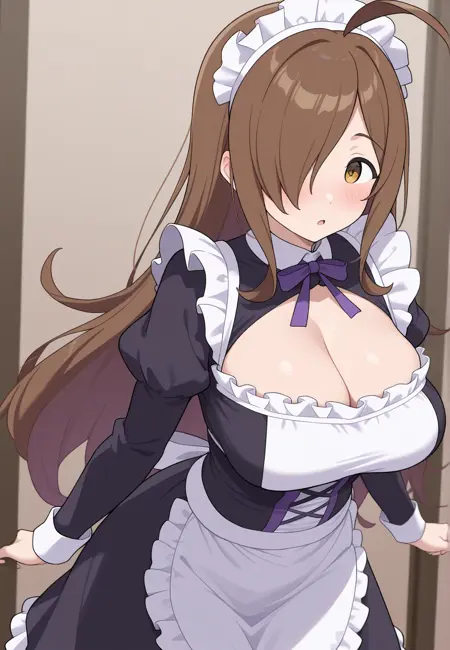Wiz-Liver020, 1girl, solo, ahoge, mature female, long hair, large breasts, hair over one eye, brown eyes, brown hair