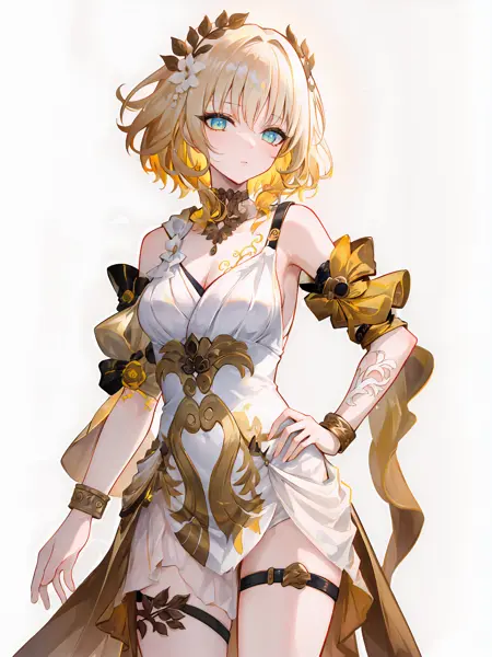 - aglaea, laurel crown, necklace, chest tattoo, detached sleeves, bracelet, thigh strap, high heels