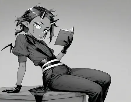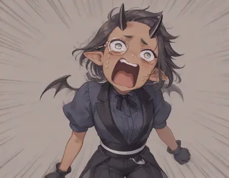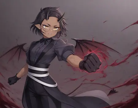 トレーニングプロンプト: 短い髪、黒髪、低いポニーテール、鬼、鬼の角、単眼鏡、暗い肌、細い悪魔の翼、スーツドレス、背中を露出、黒い手袋