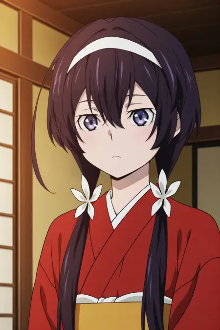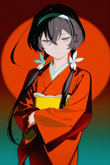 Trigger word is bsdkyouka. For her main appearance, add "low twintails, hairband, hair flower, red kimono, obi, tasuki".