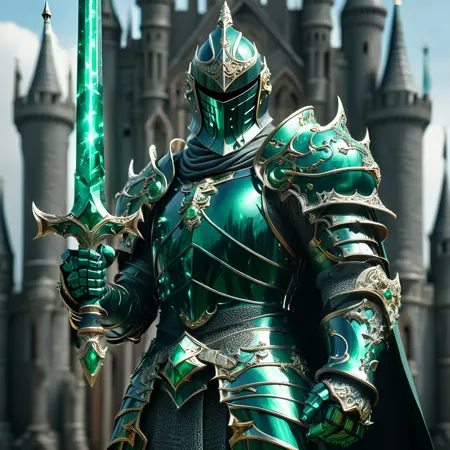"A handsome young man with dark brown hair and green eyes, wearing black armor decorated with gold and green accents holding an emerald sword, with detailed face features, in cinematic lighting with a cinematic shot from a cinematic angle, in a dark fantasy medieval setting, (hkstyle:1.2), (green flames comming from the blade of his sword:1.1)"