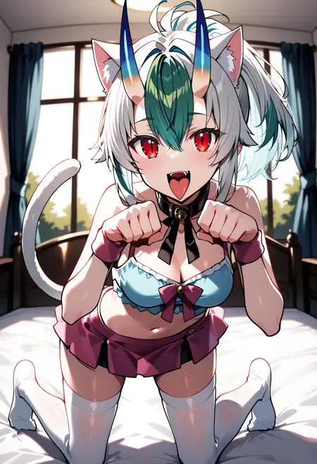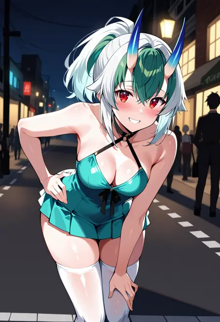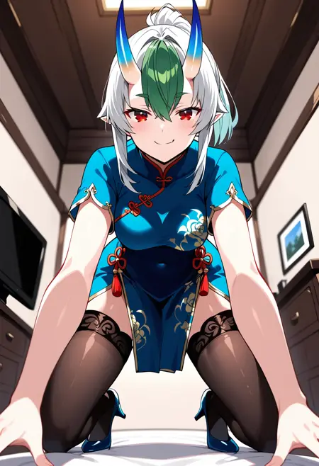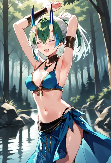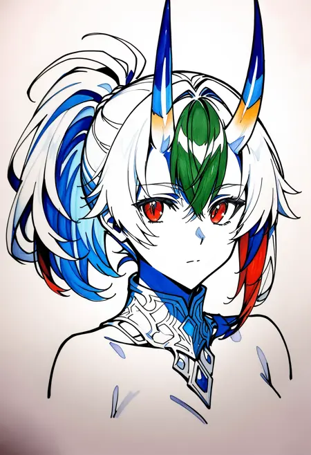 wrathfemkumodesu、ポニーテール、鬼の角、青い角、多色の髪