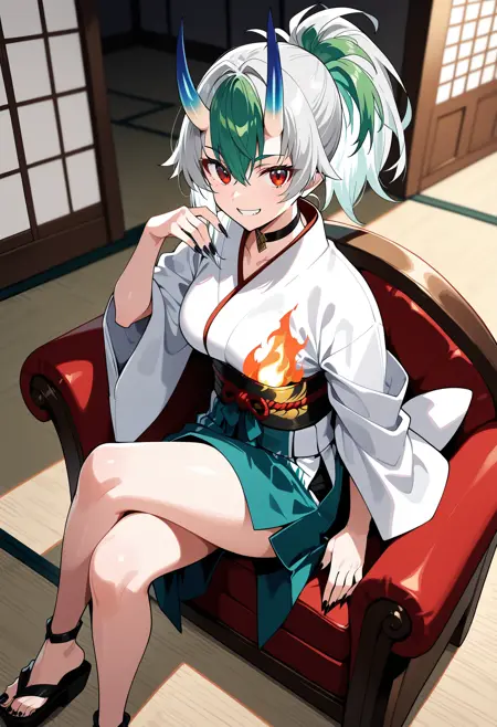 和服、鞘、鞘に収まった、爪、サンダル、鋭い爪、緑の袴、黒の首輪、ロープ、黒い爪、刀鞘、火の模様