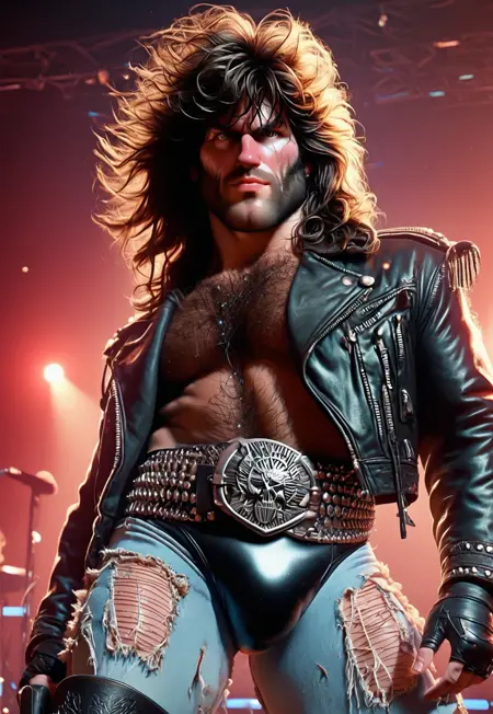 キップ・ネイスティに会いましょう。彼は恥じることなく過剰を貫くグラム・メタルの象徴です。ライオンのたてがみのようなふわふわのヘアスタイルは、まるで専用の着衣室を必要とするかのよう。革ジャケットは少し開けてあり、胸毛が大好きであることを思い出させてくれます。彼のジーンズはぼろぼろで、ほとんど違法レベルですが、輝くベルトのバックルと、もちろん真ん中で目立つコッドピースに目が行きます。彫刻のように整った頬骨にきらめく汗が、まさに「さっきまで激しく演奏していた…それどころか、ほかのこともいくつかやったかも」って叫んでいるみたい。