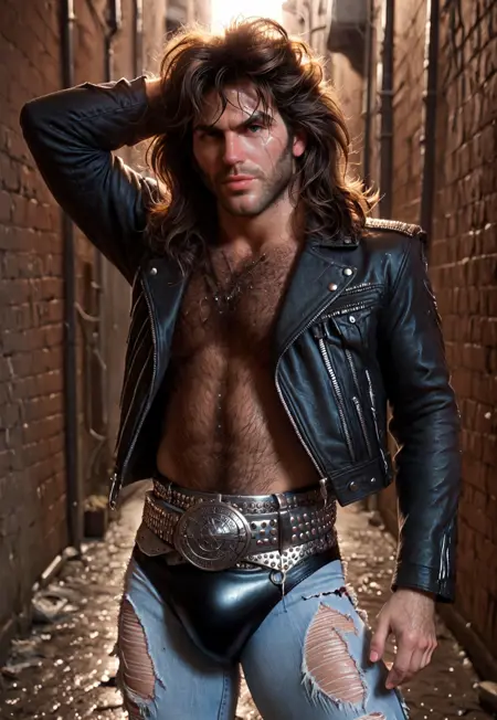 认识一下基普·耐斯蒂,这位毫不掩饰的奢靡风格的华丽金属乐代言人。他一头蓬松如雄狮般的卷发,几乎需要单独的化妆间;皮夹克半开着,提醒你他酷爱胸毛。他的牛仔裤破得几乎违法——但你仍不禁注意到他闪亮的腰带扣,当然还有居于中心位置的胯部护具。他雕塑般的颧骨上微微泛着汗水,仿佛在呐喊:“我刚结束一场狂野演出……可能还有别的事情。”