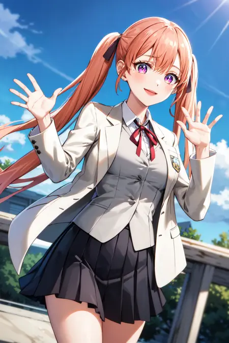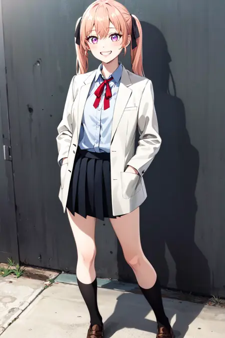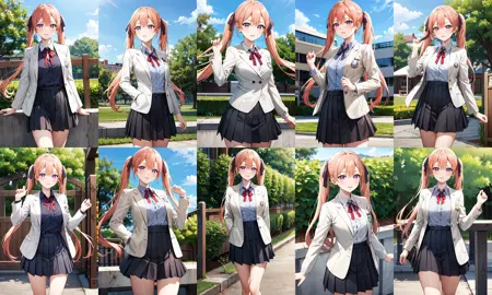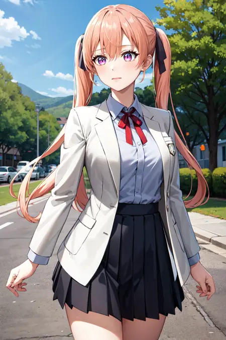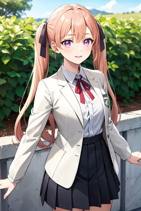 aaerika, 长发, 双马尾, 发带, 校服, 领结, 有领衬衫, 白色夹克, 黑色裙子, 百褶裙