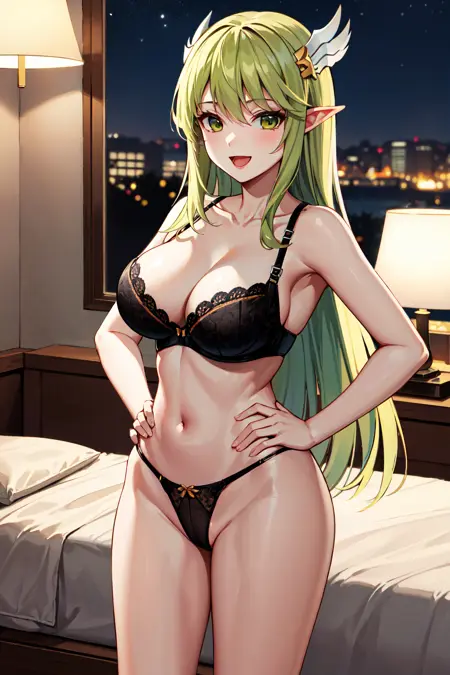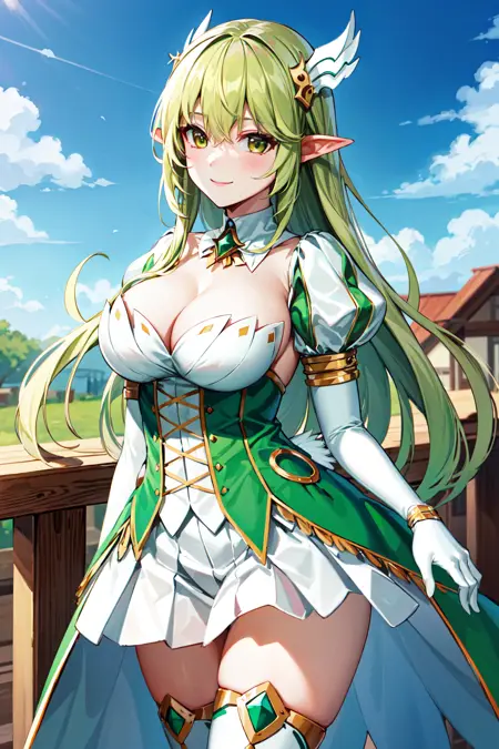 아우트피트2 (그랜드 아처)rena2nd, 긴 머리, 녹색 머리, 머리 장식, 큰 가슴, 분리된 칼라, 가슴 노출, 녹색 드레스, 퍼프 소매, 코르셋, 흰 장갑, 팔꿈치 장갑, 흰 허벅지 양말