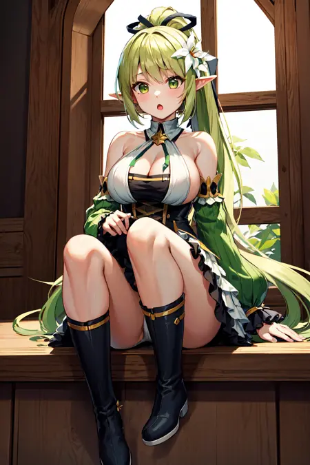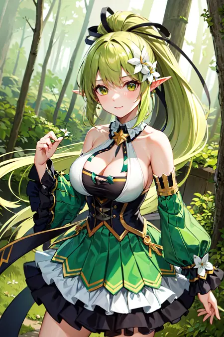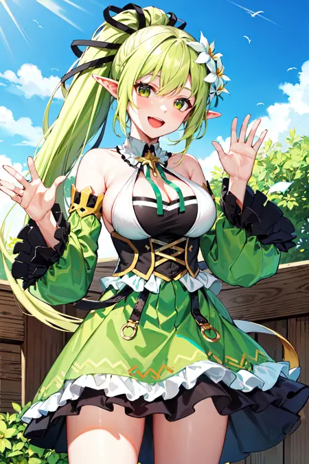 아우트피트1 (윈드 스니커즈)rena1st, 긴 머리, 녹색 머리, 높은 포니테일, 머리 꽃, 머리 끈, 큰 가슴, 목 끈, 프릴이 있는 드레스, 분리된 소매, 녹색 소매, 녹색 치마, 프릴이 있는 치마