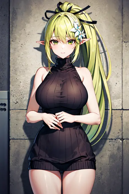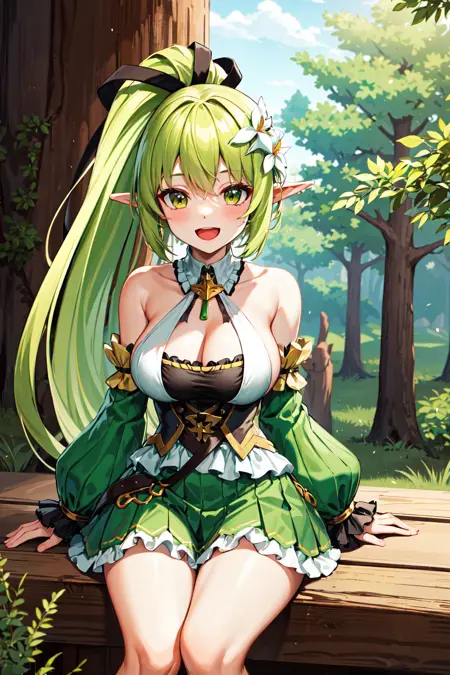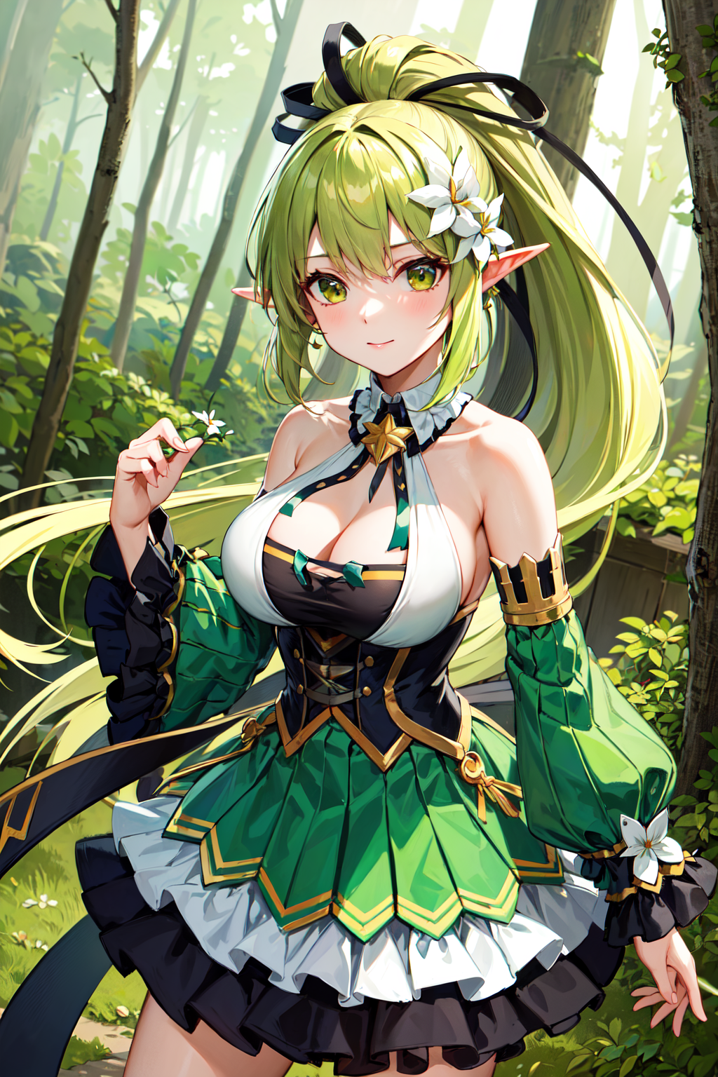 衣装1(ウィンドスニーカー)rena1st, 長髪, 緑色の髪, 高いポニーテール, 髪の花, 髪のリボン, 大きな胸, 首のリボン, フリル付きドレス, 外側の袖, 緑色の袖, 緑色のスカート, フリル付きスカート