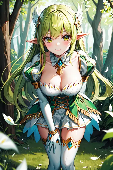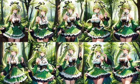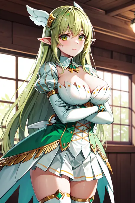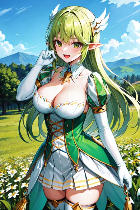 衣装2(グランドアーチャー)rena2nd, 長髪, 緑色の髪, 髪の装飾, 大きな胸, 外側のカラー, 胸元, 緑色のドレス, フリル付き袖, コルセット, 白い手袋, 肘まである手袋, 白いハイソックス