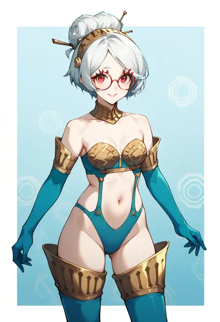 highcut-teal, hairband, choker, collar, bare shoulders, teal elbow gloves, navel, teal thighhighs, thigh boots, gold, gold metal