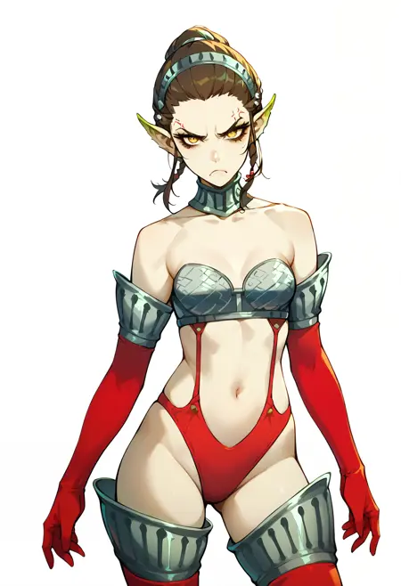 highcut-red, hairband, choker, collar, bare shoulders, red elbow gloves, navel, red thighhighs, thigh boots, silver, silver metal