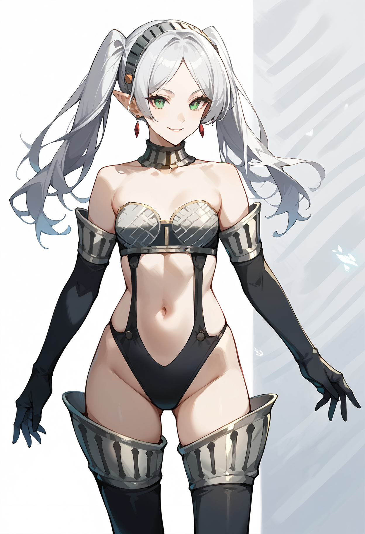 highcut-black, hairband, choker, collar, bare shoulders, black elbow gloves, navel, black thighhighs, thigh boots, silver, silver metal
